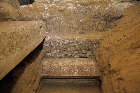 Πριν απü αυτü, την ΠαρασκευÞ, απομακρýνθηκαν τα χþματα, πßσω απü τον δεýτερο διαφραγματικü τοßχο, προκειμÝνου να εξισορροπηθοýν οι γεωστατικÝς ωθÞσεις των γαιþν μεταξý των δýο χþρων. Ετσι, αποκαλýφθηκε, σε απüσταση 2 περßπου μÝτρων απü τη θüλο και 4,5 μÝτρων, περßπου, απü το δÜπεδο, μαρμÜρινη ορθογþνια πλÜκα, μÞκους 4.2μ, πλÜτους 1μ. και πÜχους 0.21μ, σε Üριστη κατÜσταση. ΕδρÜζεται οριακÜ σε πþρινο λßθο του τρßτου διαφραγματικοý τοßχου και στο ανþτερο τμÞμα ορθομαρμÜρωσης, το οποßο φÝρει κυμÜτιο. Στο κÜτω μÝρος της πλÜκας υπÜρχει γραπτüς διÜκοσμος σε γαλÜζιο, κüκκινο και κßτρινο χρþμα, üπου παριστÜνονται φατνþματα με ρüδακα στο κÝντρο. Πρüκειται για τμÞμα της οροφÞς του συγκεκριμÝνου χþρου.
