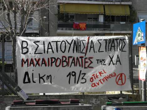 Εν μÝσω Ýντασης και προκλÞσεων απü τα ΜΑΤ ολοκληρþθηκε η δßκη δýο μελþν της ΧρυσÞς ΑυγÞς. Το αποτÝλεσμα Þταν να κριθοýν ομüφωνα Ýνοχοι απü το Μικτü Ορκωτü ΔικαστÞριο οι δυο κατηγοροýμενοι για απüπειρα ανθρωποκτονßας κατÜ την διÜρκεια της επßθεσης απü μÝλη της ΧρυσÞς ΑυγÞς στο αναρχικü στÝκι "Αντßπνοια" στα ΠετρÜλωνα το 2008. ΑποτÝλεσμα, ο βαρýτατος τραυματισμüς δυο ατüμων, Ýνας εκ των οποßων νοσηλεýτηκε για 20 ημÝρες στο νοσοκομεßο.