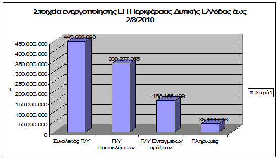 Είναι δυο κορυφαία θέματα που παίζουν σημαντικό ρόλο στην αναπτυξιακή διαδικασία της περιοχής μας. Εξάλλου κάνουμε πράξη αυτό που από την πρώτη στιγμή δεσμευτήκαμε. Να ενημερώνουμε συνεχώς τους πολίτες για όλα τα θέματα της Περιφέρειας. Να κινούμαστε με διαφάνεια παντού. Έρχομαι στο πρώτο θέμα. Την πορεία του ΕΣΠΑ όσο αφορά το πρόγραμμα της Περιφέρειας στη Δυτική Ελλάδα. Μέχρι σήμερα (5 Αυγούστου 2010) η ενεργοποίηση του Επιχειρησιακού Προγράμματος στην Περιφέρεια Δυτικής Ελλάδας υπήρξε ιδιαίτερα σημαντική όπως θα διαπιστώσετε κι εσείς με τα στοιχεία που παραθέτουμε στη συνέχεια. Θα σας θυμίσω, ότι το Δεκέμβριο του 2009 ελάχιστα έργα είχαν ενταχτεί στο δικό μας κομμάτι του ΕΣΠΑ και η απορρόφηση ήταν μηδαμινή. Επτά μήνες αργότερα το τοπίο έχει αλλάξει. Προχωρήσαμε στην υπογραφή της Επιχειρησιακής Συμφωνίας Υλοποίησης, δηλαδή της εκχώρησης σε εμάς, σχεδόν, του συνόλου των διαθέσιμων πόρων για όλη την προγραμματική περίοδο του Περιφερειακού Επιχειρησιακού Προγράμματος. Σας θυμίζω ακόμη ότι η πορεία της Περιφέρειας μας αποτιμήθηκε θετικά και από τους εκπροσώπους της Ευρωπαϊκής Επιτροπής στην 3η Επιτροπή Παρακολούθησης του Προγράμματος, πρόσφατα, στην Αρχαία Ολυμπία. Μέχρι σήμερα (5 Αυγούστου 2010) η πορεία του προγράμματος δείχνει την παρακάτω εικόνα σύμφωνα με τα στοιχεία του Κοινού Ολοκληρωμένου Πληροφοριακού Συστήματος μέσα από το οποίο παρακολουθούν την πορεία μας οι αρμόδιες Ελληνικές και Κοινοτικές Αρχές. Ειδικότερα έχει προκηρυχθεί το μεγαλύτερο μέρος του εκχωρημένου Προϋπολογισμού των Θεματικών Προτεραιοτήτων του προγράμματος. Οι προκηρύξεις ανέρχονται στο ποσό των 338.277.955,16 € το οποίο αντιστοιχεί σε ποσοστό 75% της συνολικής δέσμευσης δημόσιας δαπάνης του προγράμματος. Αντίστοιχα το ποσό των ενταγμένων έργων και δράσεων σήμερα ανέρχεται στα 155.165.108,72 € ποσό που αντιστοιχεί στο 35% της συνολικής δέσμευσης δημόσιας δαπάνης του προγράμματος. Τέλος, οι πληρωμές αυξήθηκαν σημαντικά και ανέρχονται στα 39.111.217 εκ €, το οποίο αντιστοιχεί σε ποσοστό 8,6 % της συνολικής δέσμευσης δημόσιας δαπάνης του προγράμματος. Είναι χαρακτηριστικό ότι οι εντάξεις των έργων και δράσεων αυξήθηκαν κατά 169,8% από το τέλος του έτους 2009 μέχρι σήμερα ενώ οι δαπάνες παρουσίασαν αύξηση σε ποσοστό 272% από το τέλος του έτους 2009 μέχρι σήμερα ιδιαίτερα σημαντικό στοιχείο για την τρέχουσα δύσκολη οικονομική περίοδο που διανύει η Χώρα.