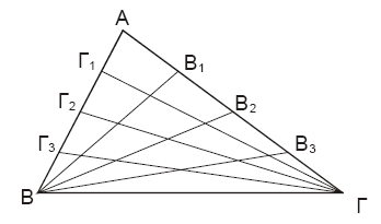 5. Έστω το τρίγωνο ΑΒΓ του σχήματος. Σε καθεμιά από τις πλευρές ΑΒ και ΑΓ έχουμε πάρει 3 τυχαία σημεία και τα ενώσαμε με τις απέναντι κορυφές Γ και Β αντιστοίχως. Με τον τρόπο αυτό, το εσωτερικό του τριγώνου διαμερίστηκε σε 16 περιοχές.