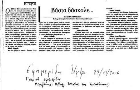 Γιατί η κοινωνία σε χρειάζεται. Γι' αυτό και σου παρέδιδε τα παιδιά της με εμπιστοσύνη: «δάσκαλε το κρέας δικό σου τα κόκαλα δικά μου»......και αν τα παιδιά σού λένε και καμιά φορά «Σώπα δάσκαλε να ακούσω το πουλί», εσύ σωπαίνεις. Πώς να σωπάσεις, όμως, τώρα με τέτοιες επιθέσεις που δέχεσαι; Πώς να σωπάσεις όταν οι «σεμνοί» και οι «έντιμοι» επιχειρούν να σε ταπεινώσουν, να βαπτίσουν τον αγώνα σου ανέντιμο;