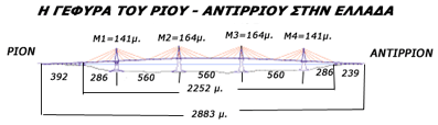 - Η Γέφυρα Ρίου - Αντιρρίου είναι η μεγαλύτερη καλωδιωτή γέφυρα στον κόσμο, με μήκος 2.252 μέτρα (2.883 μέτρα με την προσθήκη των γεφυρών πρόσβασης) και με τρία κεντρικά ανοίγματα των 560 μέτρων και δύο πλευρικά των 286 μέτρων, καθώς και η μοναδική που εδράζεται σε βάθος έως 65 μ. κάτω από την επιφάνεια της θάλασσας.
