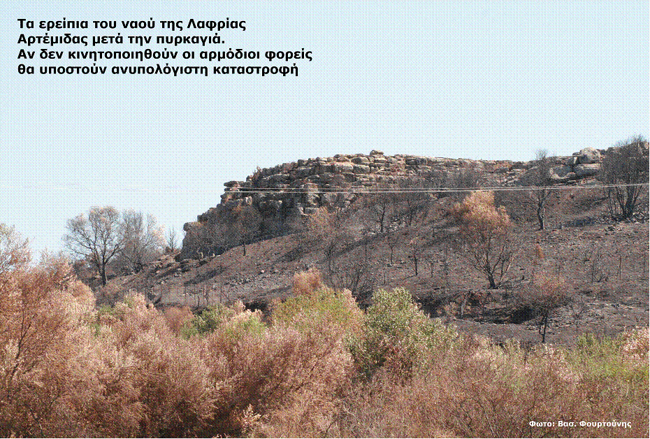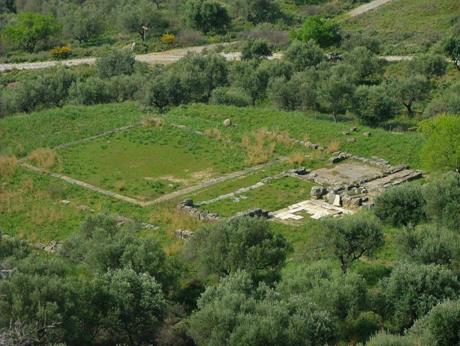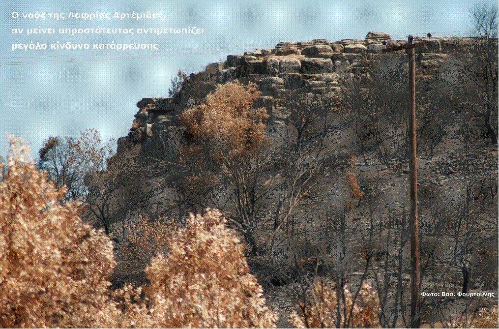 | Ο ναός της Λαφρίας Αρτέμιδας και στο βάθος η Βαράσοβα |