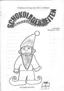 Με μεγάλη χαρά πήραμε την εφημερίδα του Δημοτικού σχολείου KGS GREBBEN Γερμανίας με τίτλο:ΣΟΚΟΛΑΤΕΝΙΕΣ ΣΕΛΙΔΕΣ και σας την παρουσιάζουμε. Στις σελίδες της διαβάζουμε για την ιππασία, το φιδίσιο αίνιγμα, συνταγές, μια συνέντευξη με τους δασκάλους τους, συμβουλές για κατασκευές παιχνιδιών και πολλά άλλα. Μπράβο σας παιδιά. Περιμένουμε να μας στείλετε κάτι για τη δική μας εφημερίδα. Την μετάφραση από τα |