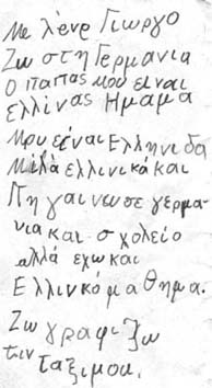 γερμανικά την έκανε η μαθήτρια της ΣΤ' τάξης του σχολείου μας Αθανασία Δάβου. Στο σχολείο αυτό φοιτούν και ελληνόπουλα, που ζουν μόνιμα στη Γερμανία και μαθαίνουν την ελληνική γλώσσα ως ξένη γλώσσα, όπως εσείς μαθαίνετε τ' Αγγλικά. Τα παιδιά της ελληνικής τάξης: Γιώργος, Έφη, Δήμητρα, Ντάνιελ, Χριστίνα, Γιάννης, Γιώργος, Κωνσταντίνος, Ειρήνη |