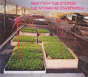 Για να μπορούμε να έχουμε ντομάτα, θα πρέπει να φυτέψουμε τους σπόρους, τους οποίους προμηθευόμαστε από τους γεωπόνους μέσα σε φακελάκια. Τα σποράκια αυτά θα φυτευτούν σε τελάρα με ειδικό χώμα, που αποτελείται από κοπριά ανακατεμένη με κανονικό χώμα (καθαρό). Λόγω των καιρικών συνθηκών, πολύ κρύο ή καύσωνας, τα τελάρα μεταφέρονται στα Θερμοκήπια. Αυτά είναι αρκετά μεγάλοι χώροι καλυμμένοι με νάιλον. Τα νάιλον έχουν την ιδιότητα ν' απορροφούν την ακτινοβολία του ήλιου και να την εγκλωβίζουν στο εσωτερικό τους. Έτσι τα φυτά φωτοσυνθέτουν καλύτερα και ταχύτερα. Επίσης