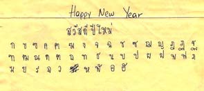 Γιάντα, Σαβαρίν και Τανίγια 12, 14 και 15 χρονών αντίστοιχα που δέχτηκαν να τους πάρουμε μια συνέντευξη σχετικά με το εκπαιδευτικό σύστημα της Ταϊλάνδης. Ερώτηση: Πόσων χρονών πάνε οι Ταϊλανδοί στο σχολείο; Απάντηση: 3 ετών πηγαίνουν στον παιδικό σταθμό, 7 ετών πηγαίνουν στο δημοτικό για 6 χρόνια, μετά πηγαίνουν 3 χρόνια στο γυμνάσιο και 3 χρόνια στο λύκειο. Όσοι θέλουν δίνουν εξετάσεις για το πανεπιστήμιο. Ερώτηση: Πόσα χρόνια είναι υποχρεωτική η εκπαίδευση στην Ταϊλάνδη; Απάντηση: 12 χρόνια δηλαδή δημοτικό, γυμνάσιο και λύκειο όμως σε πολλά φτωχά χωριά αυτό δεν ισχύει γιατί οι γονείς δεν μπορούν να αντέξουν οικονομικά δωδεκάχρονες σπουδές και τα παιδιά τους πρέπει να δουλέψουν για να βοηθήσουν την οικογένειά τους. Ερώτηση: Τι μαθήματα διδάσκονται στα ταϊλανδικά δημοτικά; Απάντηση: Κάνουμε ταϊλανδική γλώσσα, γυμναστική, μαθηματικά, φυσική, ιστορία, κοινωνική ιστορία που μαθαίνουμε ιστορία και θρησκευτικά μαζί, και αγγλικά. Ερώτηση: Μαθαίνετε κι άλλες ξένες γλώσσες εκτός από αγγλικά; Απάντηση: Στο δημοτικό όχι αλλά στο γυμνάσιο έχουμε και δεύτερη ξένη γλώσσα που ανάλογα με το σχολείο μπορεί να είναι κινέζικα, γερμανικά ή γαλλικά. Ερώτηση: Ποιες μέρες έχετε σχολείο; Απάντηση: Από Δευτέρα έως και Παρασκευή. Τα μαθήματα αρχίζουν στις 8 π.μ. και τελειώνουν στις 3 μ.μ. Ενδιαμέσως τρώμε μεσημεριανό. Ερώτηση: Πότε έχετε διακοπές στην Ταϊλάνδη; Απάντηση: Έχουμε ένα μήνα χειμερινές διακοπές τον Οκτώβριο και δύο μήνες καλοκαιρινές διακοπές τον Μάρτιο και τον Απρίλιο. Στις 13 Απριλίου γιορτάζουμε την ταϊλανδική πρωτοχρονιά αλλά έχουμε και 3 μέρες αργία στις αρχές Ιανουαρίου γιατί γιορτάζουμε τη διεθνή πρωτοχρονιά. Ερώτηση: Είναι εύκολη γλώσσα τα ταϊλανδικά; Απάντηση: Όχι καθόλου. Η ταϊλανδική αλφάβητος έχει 44 σύμφωνα και 21 φωνήεντα. Δηλαδή συνολικά 65 γράμματα. Γράφεται από αριστερά προς τα δεξιά και δεν υπάρχουν καθόλου κεφαλαία γράμματα. Ερώτηση: Μπορείτε να μας γράψετε στα ταϊλανδικά μερικά γράμματα της αλφαβήτου και "Ευτυχισμένος ο καινούριος χρόνος"; Απάντηση: Φυσικά κι ευχόμαστε σε όλα τα παιδιά του σχολείου σας να είναι πάντα χαρούμενα κι ευτυχισμένα και να μπορέσουν να επισκεφτούν κάποτε την Ταϊλάνδη.