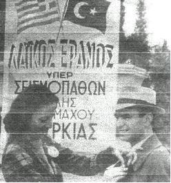 βοήθειας "προς τη σύμμαχο και φίλη Τουρκία", όπως έγραφαν χαρακτηριστικά οι πινακίδες στα κιόσκια που εμφανίστηκαν για το σκοπό αυτό σε κεντρικά σημεία της πρωτεύουσας. Ακολούθησαν οι καταστροφικοί σεισμοί της Κεφαλονιάς… Τι σύμπτωση!!! Αυτό που παραμένει άγνωστο είναι αν το κλίμα φιλίας που έχει δημιουργηθεί θα μπο-ρέσει να διατηρηθεί τούτη τη φορά. Τότε το κλίμα φιλίας δε διατηρήθηκε, γιατί ακολούθησαν οι άγριοι διωγμοί των Ελλήνων από την Κωνσταντινούπολη το Σεπτέμβριο του 1955. Εμείς πάντως να ευχη-θούμε να διατηρηθεί το κλίμα φιλίας τούτη τη φορά, γιατί δεν έχουμε να μοιράσουμε τίποτα με τους γείτονές μας.